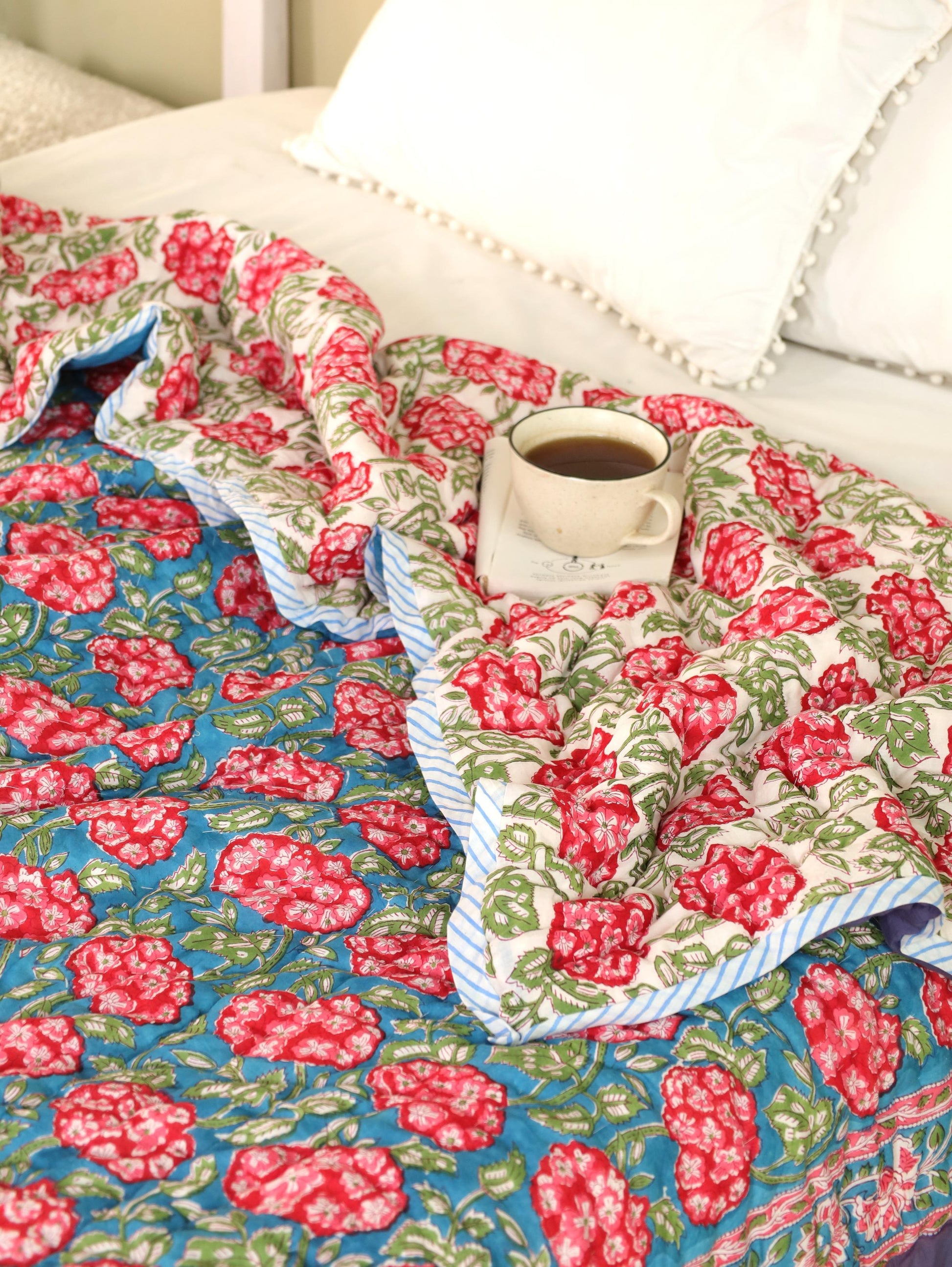 Materials and Craftsmanship: Our quilts are made from 100% premium cotton, known for its softness, breathability, and durability. We ensure that every quilt not only feels luxurious against your skin but also stands the test of time. Each piece is adorned with hand block prints, a traditional technique where skilled artisans in Sanganer use hand-carved wooden blocks to apply intricate patterns. This meticulous process results in unique designs that add a touch of elegance and artistry to each quilt.