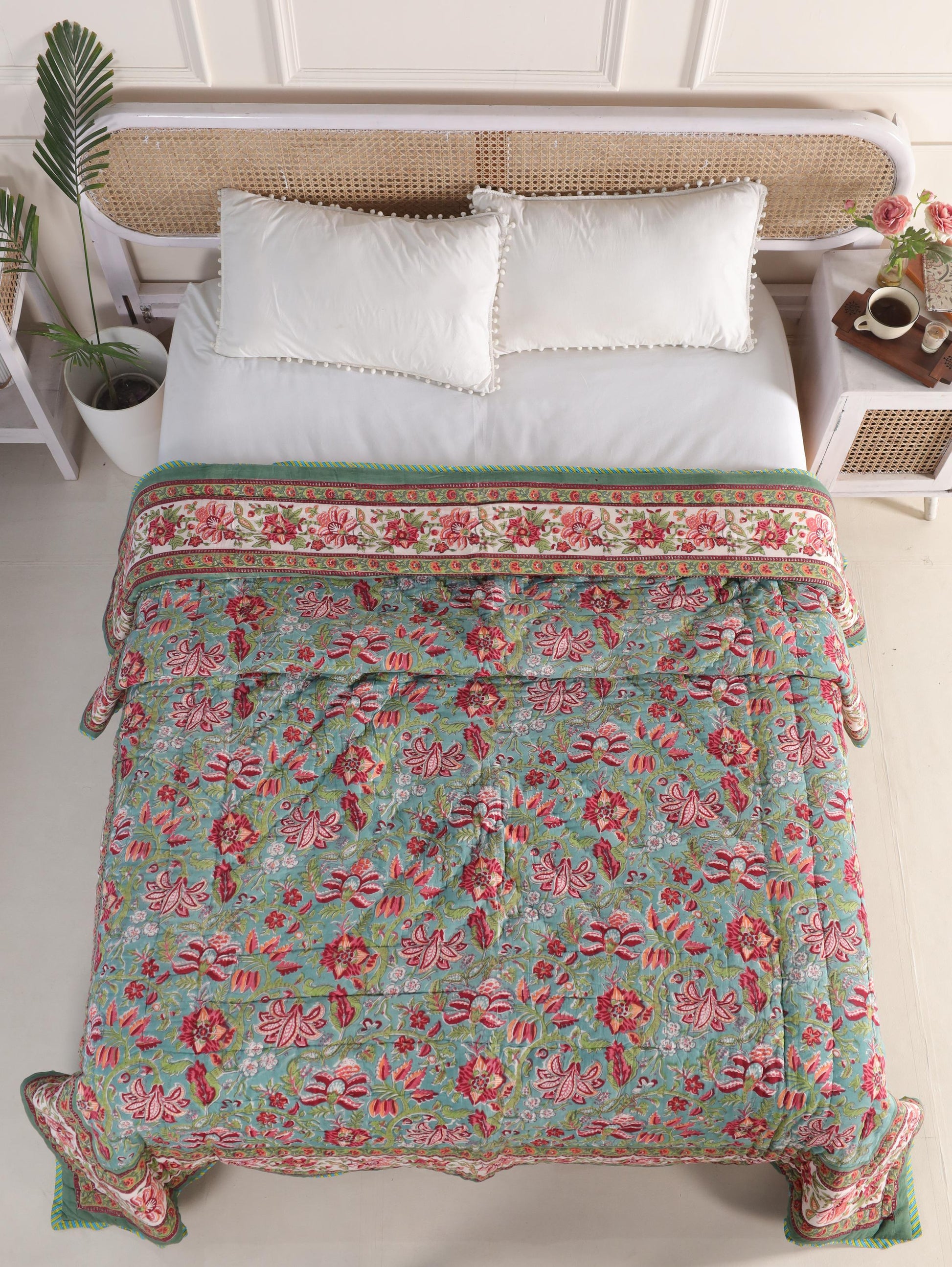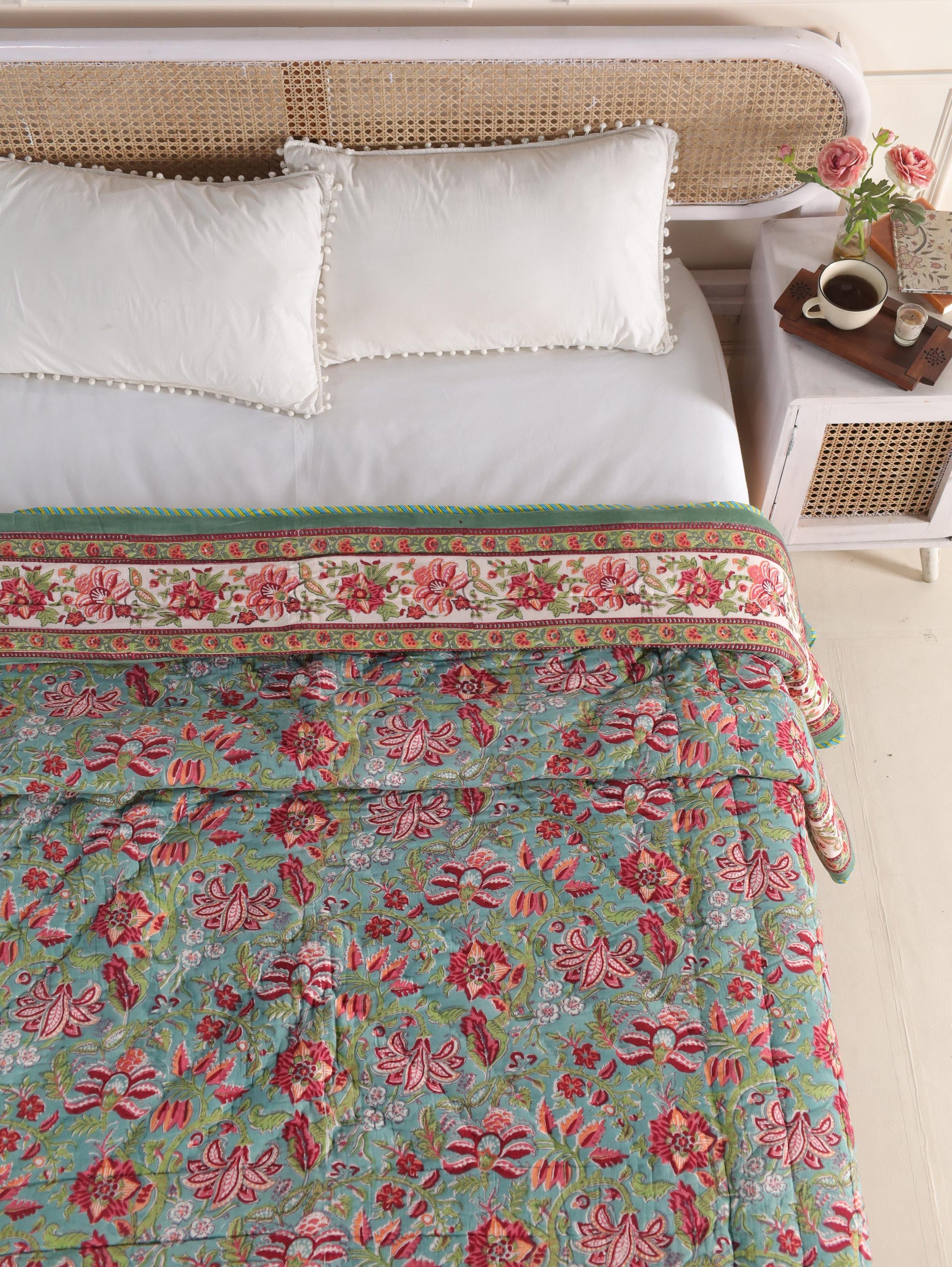 Materials and Craftsmanship: Our quilts are made from 100% premium cotton, known for its softness, breathability, and durability. We ensure that every quilt not only feels luxurious against your skin but also stands the test of time. Each piece is adorned with hand block prints, a traditional technique where skilled artisans in Sanganer use hand-carved wooden blocks to apply intricate patterns. This meticulous process results in unique designs that add a touch of elegance and artistry to each quilt.