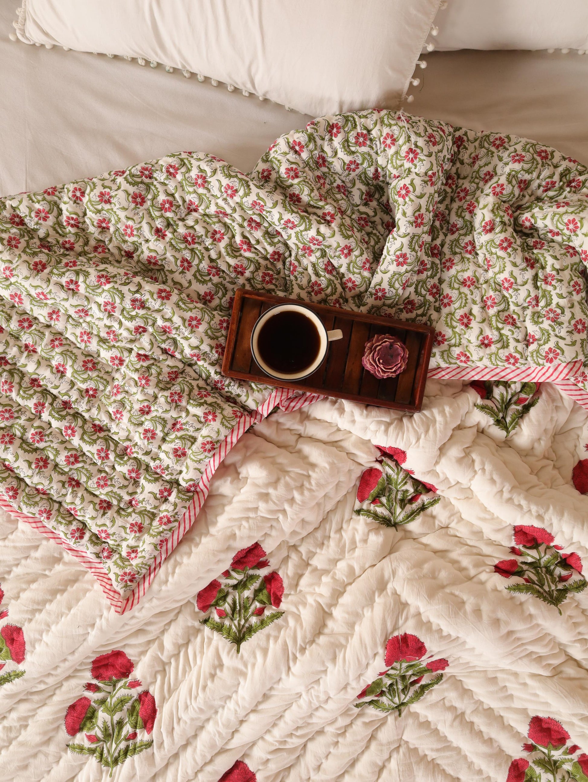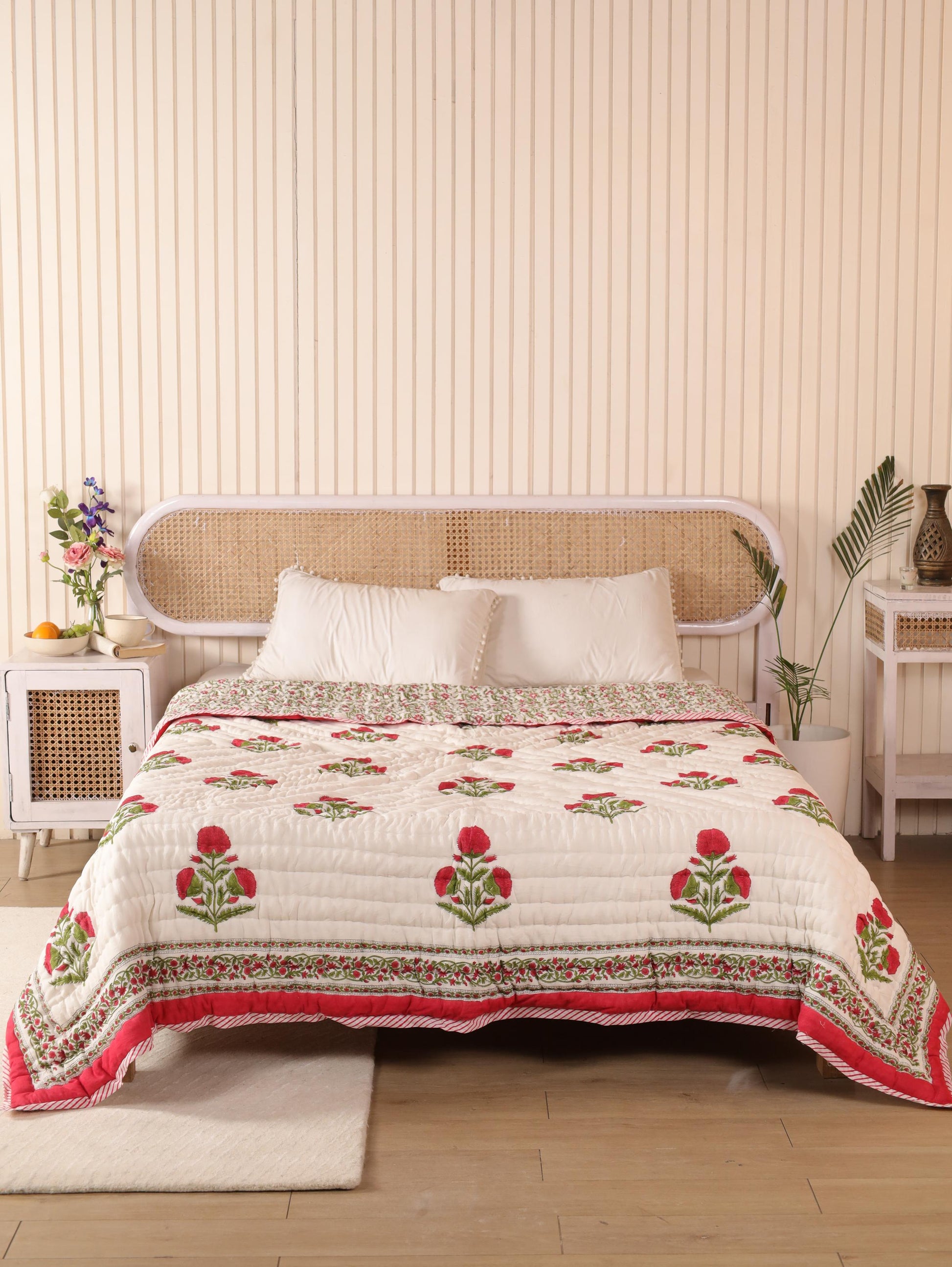 Materials and Craftsmanship: Our quilts are made from 100% premium cotton, known for its softness, breathability, and durability. We ensure that every quilt not only feels luxurious against your skin but also stands the test of time. Each piece is adorned with hand block prints, a traditional technique where skilled artisans in Sanganer use hand-carved wooden blocks to apply intricate patterns. This meticulous process results in unique designs that add a touch of elegance and artistry to each quilt.