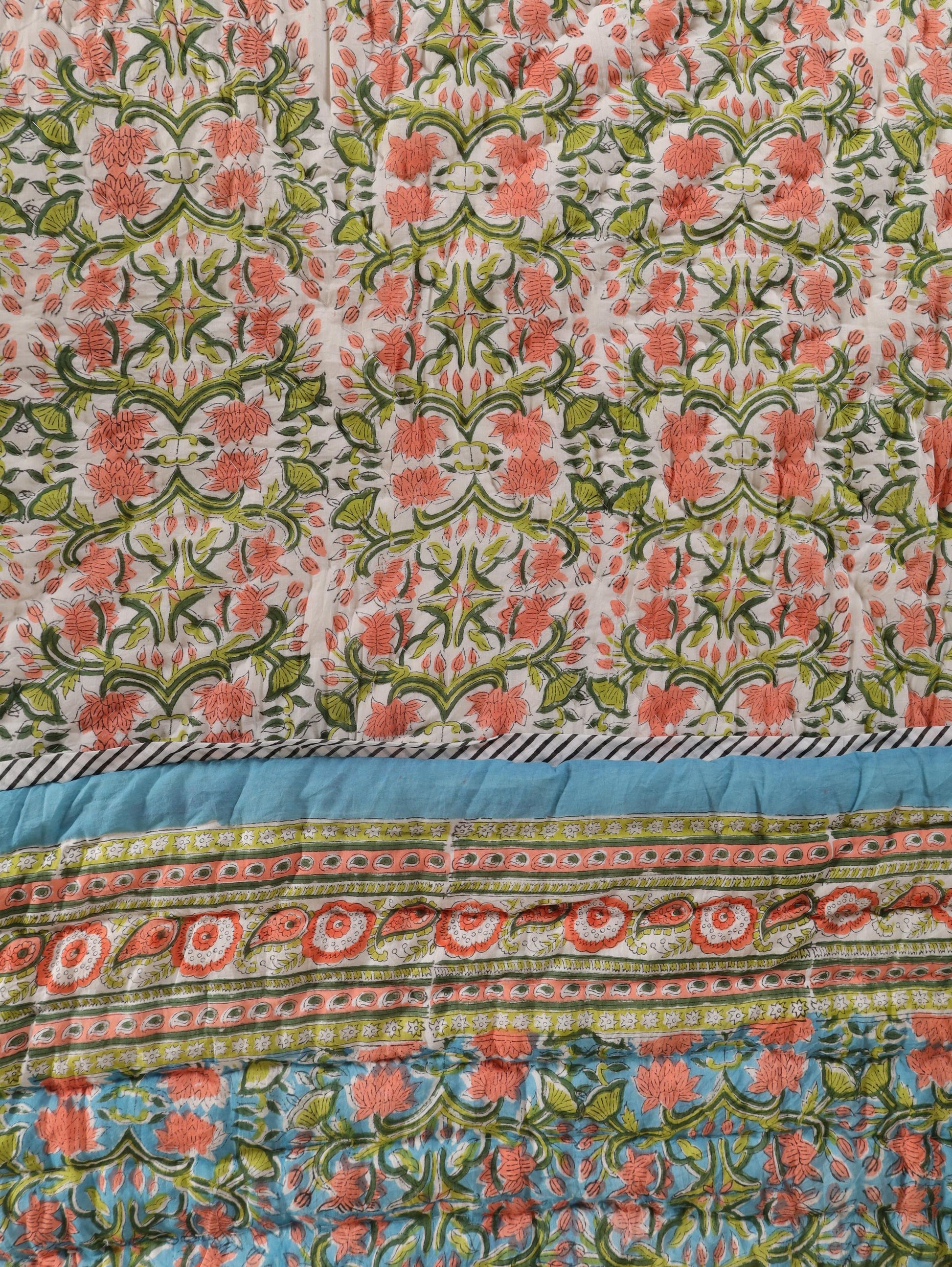 Materials and Craftsmanship: Our quilts are made from 100% premium cotton, known for its softness, breathability, and durability. We ensure that every quilt not only feels luxurious against your skin but also stands the test of time. Each piece is adorned with hand block prints, a traditional technique where skilled artisans in Sanganer use hand-carved wooden blocks to apply intricate patterns. This meticulous process results in unique designs that add a touch of elegance and artistry to each quilt.
